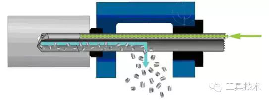 槍鉆(見圖1)的鉆柄是空的,由內(nèi)外部供應的切削液流經(jīng)鉆頭內(nèi)輸送管,并強行流經(jīng)切削頭內(nèi)的孔。鉆柄外側(cè)有一個沿著長度方向的V形槽,切削液攜帶切屑通過此V形槽,并經(jīng)過鉆頭外側(cè),最終切屑從孔中排出。槍鉆可應用于普通加工中心,但是需要高壓力的切削液。