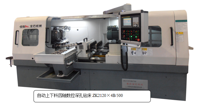 應廣大用戶的要求,金石機械在之前制造四軸槍鉆機床的基礎(chǔ)上,針對工件裝卸的不便及費時的缺點,研發(fā)了如下自動上下料的四軸深孔鉆床。大大提高了槍鉆機床的利用率,并降低了操作工人的勞動強度。很快得到廣泛應用。