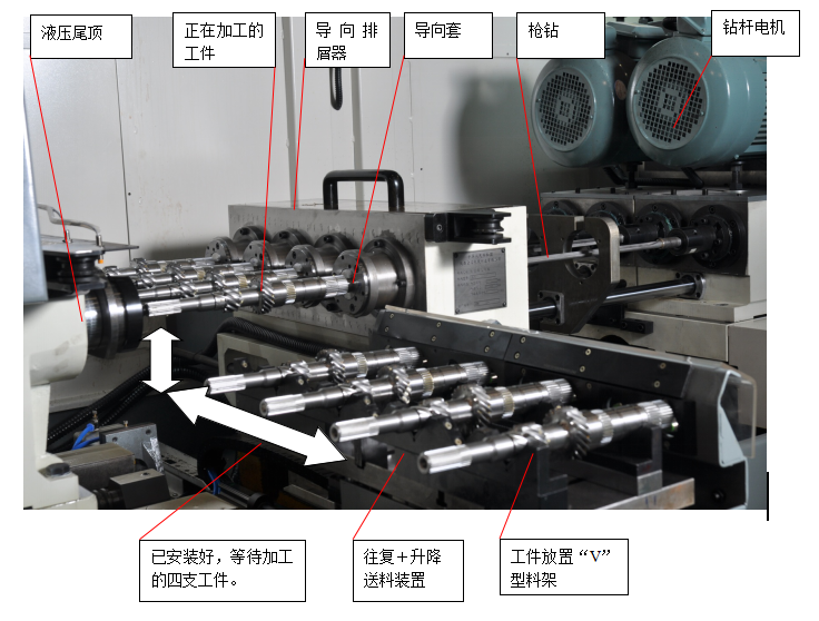 該機床的工件裝卸由人工實施。即人工安裝四支工件在預定位支架上,機床開始深孔鉆削。加工完成后,機床停止加工,人工將加工好的四支工件取走,再重新安裝上四支新工件。往復運行。