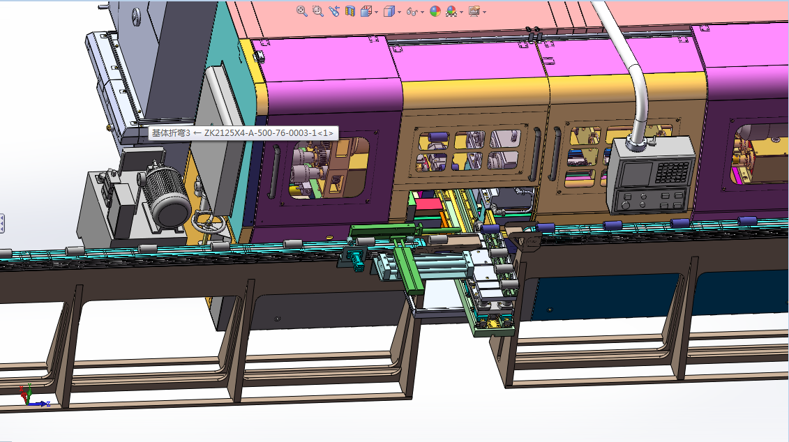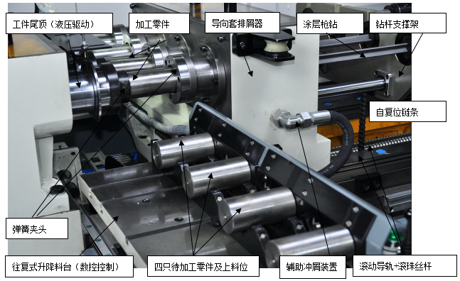 機(jī)床具備四主軸、八工位設(shè)計(jì),工件采用彈簧夾頭通過零件外圓自動(dòng)定位夾緊。機(jī)床配置伺服驅(qū)動(dòng)數(shù)控控制的自動(dòng)往復(fù)升降式上料臺,其料臺的數(shù)控橫移、升降以及固定的上下料區(qū)域設(shè)計(jì),均可使機(jī)床以極好的適應(yīng)性匹配適宜的如桁架機(jī)械手或六軸機(jī)器人或功能氣缸等自動(dòng)化形式,槍鉆工序的整個(gè)加工過程則在數(shù)控方式下實(shí)現(xiàn)了完全的自動(dòng)化加工。