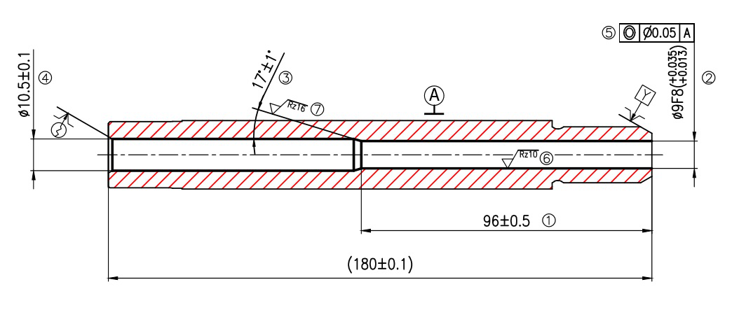 2. φ10.5±0.1,該孔的加工難點(diǎn)在于孔底17°±1°的斜度。
