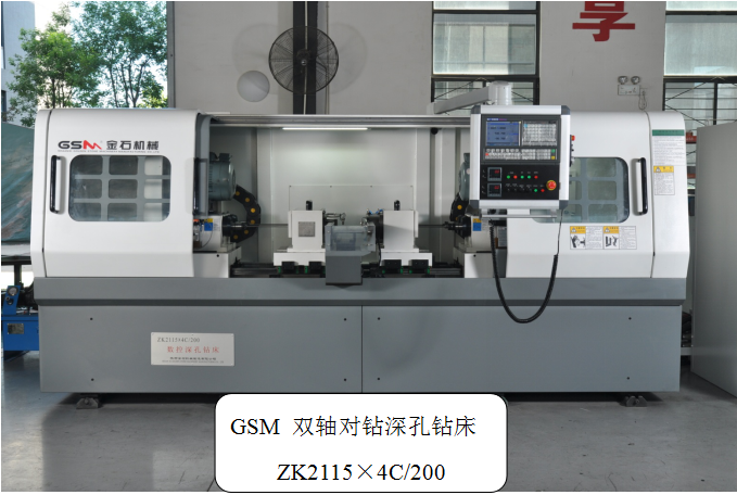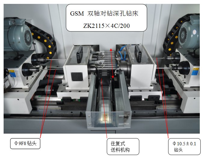 1. 機(jī)床結(jié)構(gòu)的選擇:因?yàn)?phi;9f8 (+0.013-0.035)孔徑公差要求非常高,又加之零件為大批量生產(chǎn),效率要求極高,所以深孔加工過(guò)程需要穩(wěn)定可靠,并且要方便刀具及工裝的調(diào)整。所以,機(jī)床的主軸數(shù)量選擇為2軸。如果選用4軸機(jī)床,則同時(shí)調(diào)整4支高精度的刀具,難度很大,也很難保證加工質(zhì)量。為了提高加工效率,考慮將左側(cè)的φ10.5±0.1深孔與φ9f8 (+0.013-0.035)同時(shí)加工。這樣可以保證工件一次裝夾,完成左右兩側(cè)孔的加工,大大提高了加工效率,加工效率比通常的四軸機(jī)床還要高很多。所以機(jī)床選擇為雙軸對(duì)鉆深孔鉆床。加工孔徑范圍:φ3~φ15。機(jī)床結(jié)構(gòu)參見(jiàn)下圖。