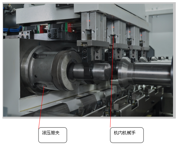 四組機(jī)內(nèi)機(jī)械手一次抓取4支工件,上升,并將工件插入筒夾內(nèi)孔;